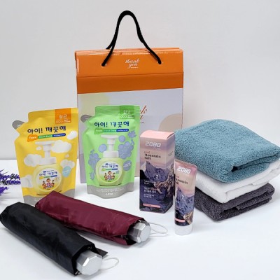 선물세트5종 아이깨끗해 핑크소금 치약 타올 타월 우산