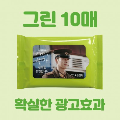 길거리 홍보용 저렴한 10매 물티슈 (교회/분양 사무실 추천) [빅사이즈라벨] 그린/초록 케이스 물티슈 10매